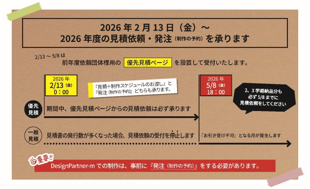 2026年2月13日(金)~5月8日(金)の期間中は、常時見積依頼・発注(制作の予約)を承ります。