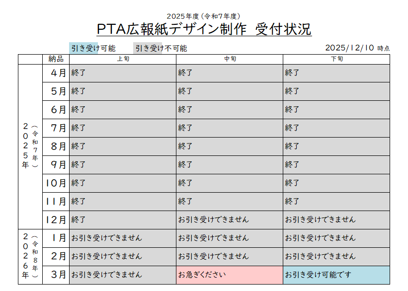 【2025/12/10更新】PTA広報紙 受付状況(デザイン制作)についてお知らせします。